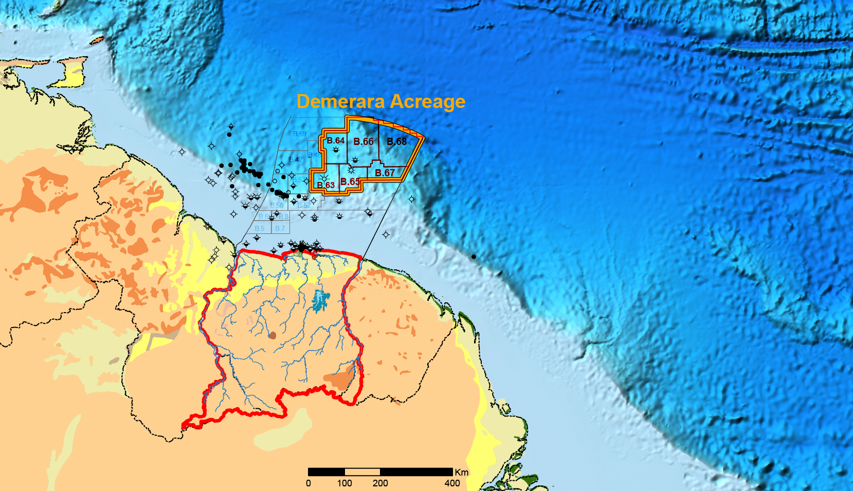 Staatsolie Hydrocarbon Institute (SHI), a wholly owned subsidiary of Staatsolie Maatschappij Suriname N.V., is pleased to announce the launch of a competitive bid round of six new blocks in the currently sparsely explored Demerara acreage of Suriname. The blocks are located east to the current offshore discoveries and have a water depth varying from 400 to 3500 meters.
